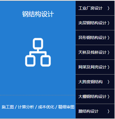 工业厂房设计、夹层钢结构设计、异型钢结构设计、天桥及栈桥设计、网架及网壳设计、大跨度钢结构、大棚钢结构设计、膜结构设计